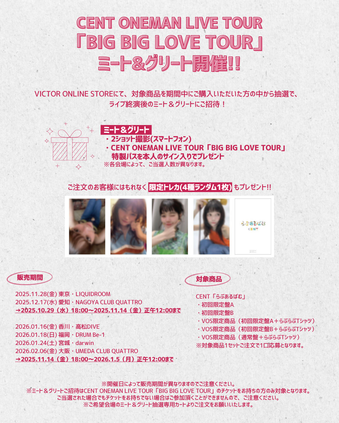 VICTOR ONLINE STOREにて、対象商品を期間中にご購入いただいた方の中から抽選で、11月から開催されるCENT ONEMAN LIVE TOUR「BIG BIG LOVE TOUR」ミート&グリートにご招待いたします。