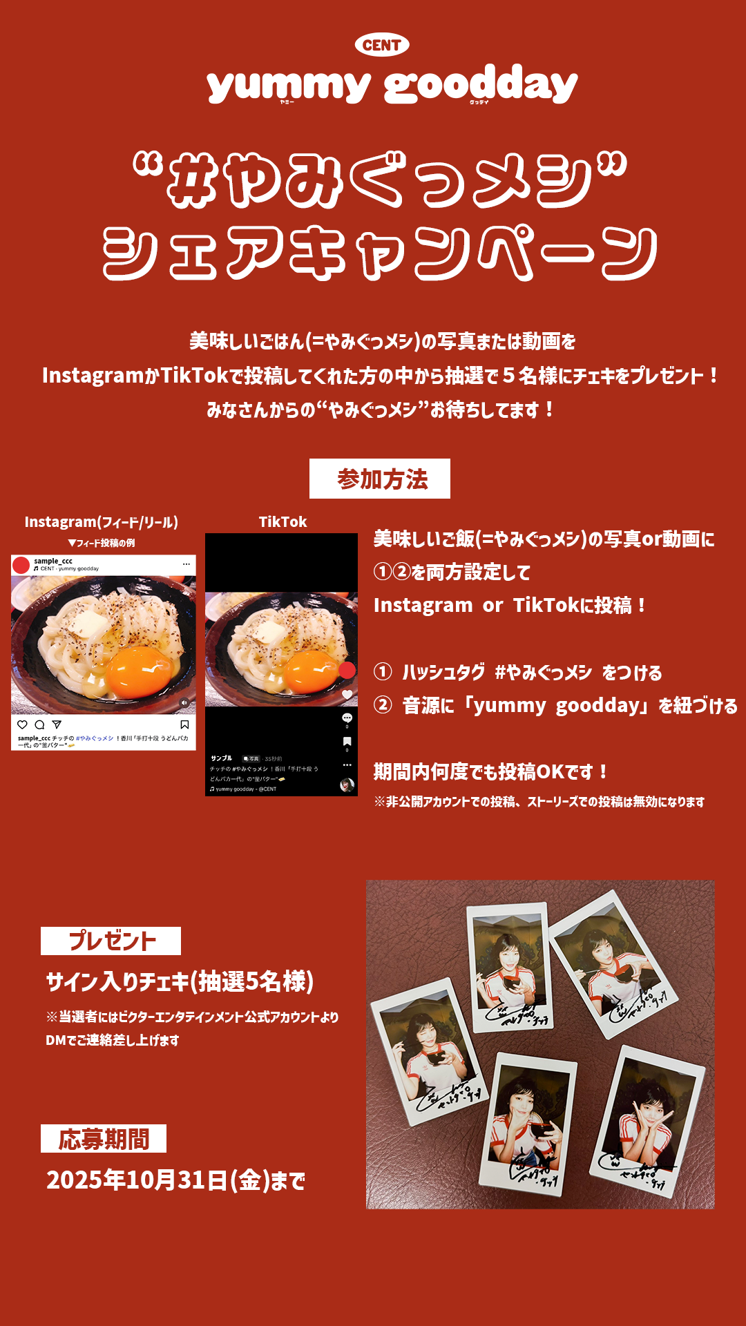 10月8日(水)リリース CENT「yummy goodday」を、美味しいご飯(=やみぐっメシ)の写真や動画をInstagramフィード / リール or TikTokに投稿してくれた方の中から抽選5名様にチェキをプレゼント!