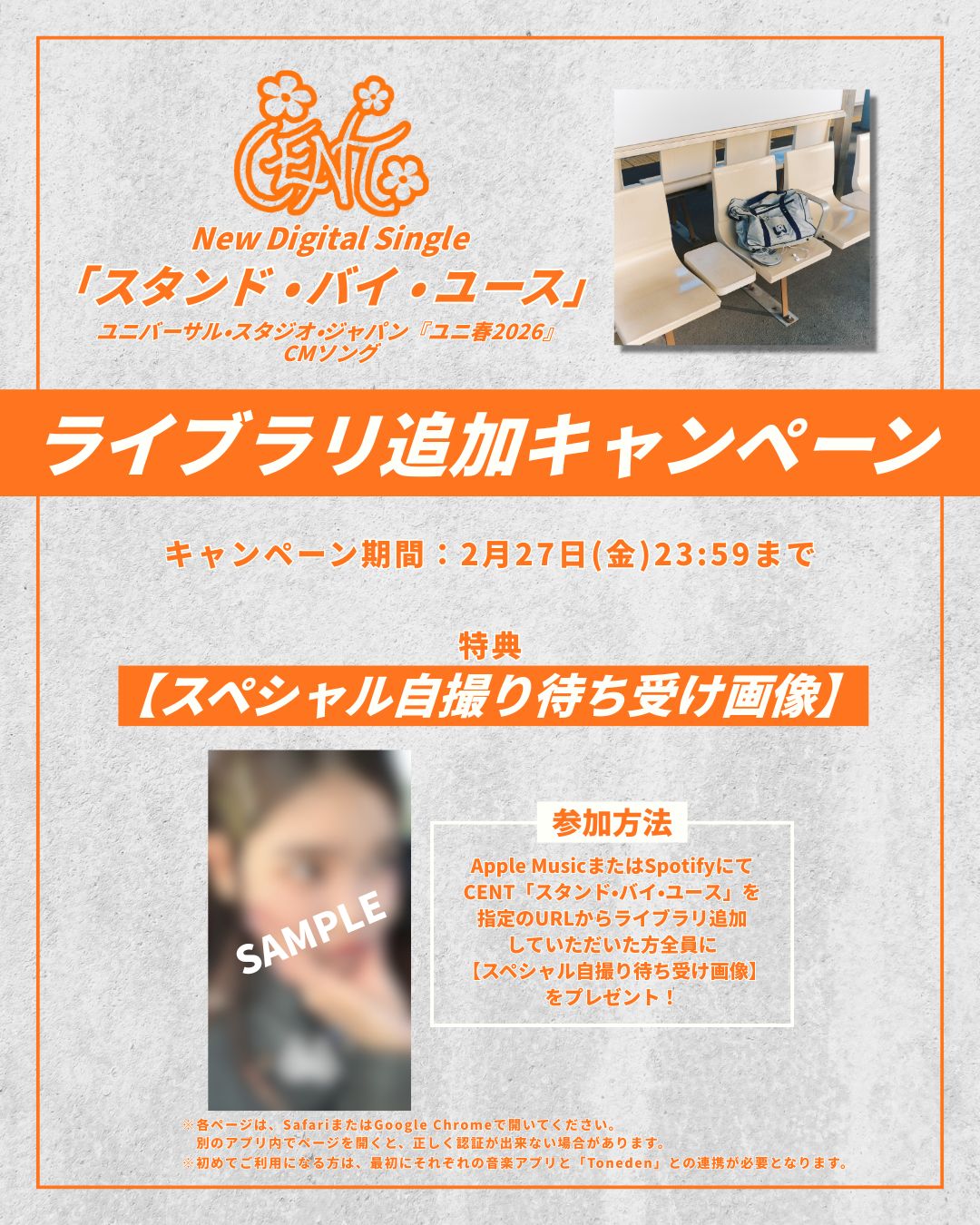 指定のURLからApple MusicまたはSpotifyでCENT「スタンド・バイ・ユース」をライブラリ追加していただいた方全員に“スペシャル自撮り待ち受け画像”をプレゼント!